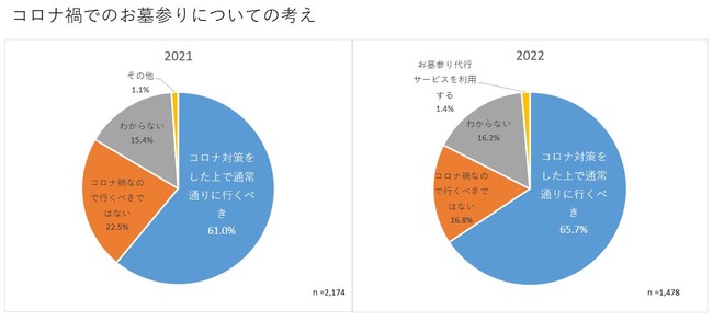 当協会が実施したアンケート調査によると、この1年間に1回以上お墓参りへ行った人の割合は、2016年と比較して24.8%減少、2021年と比較して0.6%増加という結果となった。これは、2020年から続くコロナ禍において、不要不急の外出を控える意識が高まっている為、お盆や年末年始に帰省する人が減ったことも大きく影響をしていると考えられる。但し、コロナ禍においても、「コロナ対策をした上でお墓参りへ行くべき」と回答した人の割合が、2021年調査と比較して4.7%増加し、「行くべきではない」と回答した人の割合が5.7%減少していることは、国民が、コロナ禍の中でも感染対策を行いながら自らの生活スタンスを確立しつつあるのではないかと推測しており、そのベースには、お墓参りの必要性を感じ、日本人の供養を習慣的に大切にする意識があると考える。またお墓参りは屋外で密になりにくいという安心感に加え、閉塞感のある社会環境において先祖供養や墓参をするこことが、心の拠り所や精神的な支えになるといった側面があるのではないかと思われる。