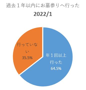 「過去1年間でお墓参りへ何回行ったか」について聞いたところ、「年に1回以上行った」と回答した人が64.5%、「行っていない」と回答した人は35.5%という結果となった。昨年の調査では「年1回以上行った」人の割合が63.9%であり、僅かであるが0.6%増加している。また2016年の「お墓参りに関するアンケート調査」で「年1回以上お墓参りへ行った」と回答した人の割合89.3%と比較すると24.8%減少している。