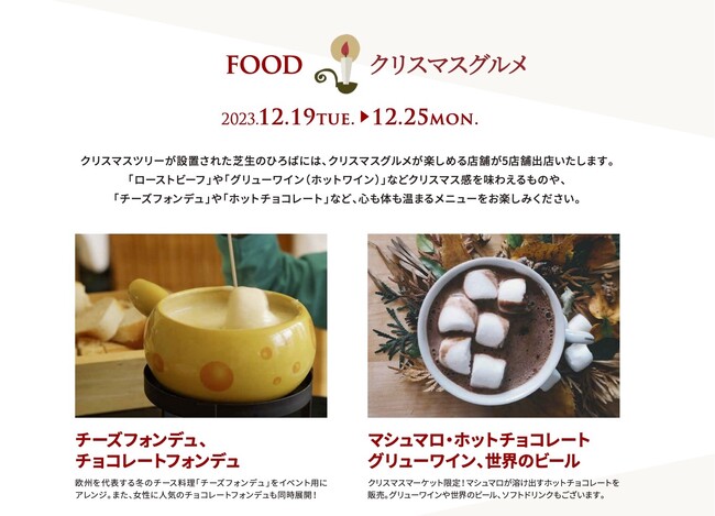 ガーデンモール 芝生のひろばにクリスマスのデコレーションを施し、クリスマスグルメやクリスマス雑貨