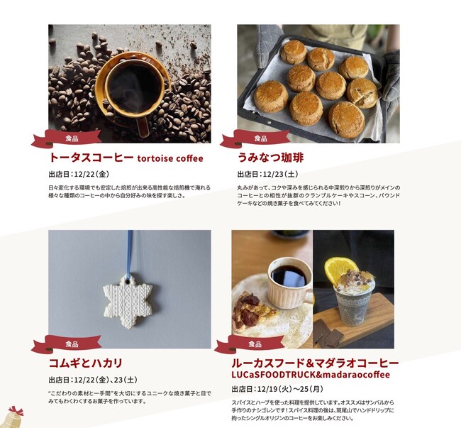 本イベントでは、クリスマスにまつわるフード・雑貨等を販売する店舗が集結。コーヒーや焼き菓子、キッチン雑貨やインテリアなども販売する。会場内はシンボリックなクリスマスツリーやクリスマス仕様のスターシェードで彩られ、軽井沢・ショッピングプラザへの来場者、旅行や観光でお越しいただいた方々にも、素敵なクリスマスの空間をお楽しみいただける。入場料無料。