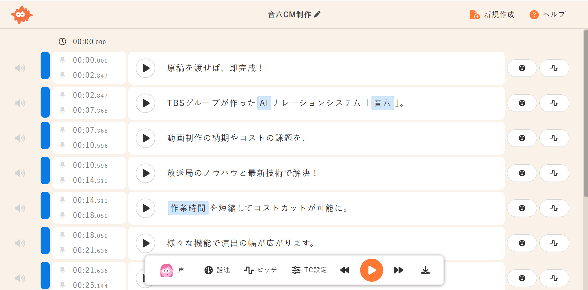 株式会社TBSテレビ(本社:東京都港区、代表取締役社長 龍宝正峰)は、株式会社TBSグロウディア(本社:東京都港区、代表取締役社長 園田憲)と共同で開発した、テキストを登録するだけでテレビ局クオリティの音声に変換できるAIナレーションシステム「音六(おとろく)AI」のサービス提供を開始しました。