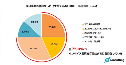 Q3で課税事業者登録の状況について「登録した(課税事業者)」「まだ登録していないが、これから登録する予定(課税事業者予定)」と回答した方へ、課税事業者登録をした(する予定の)時期について聞いたところ、「2022年9月以前」25.0%、「2022年10月~2023年3月」18.5%、「2023年4月~9月」31.5%と、合わせて75.0%の方が、インボイス制度施行前までに課税事業者登録を済ませていたことがわかりました。