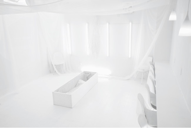 見渡す限り真っ白の横浜の異空間で白に融けていく格安生前葬。コロナ禍で十分な葬儀ができなかった方向けの弔い直しも。