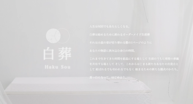 これまで生きてきた時間を結晶にする場として 生前のうちに理想の葬儀を共有する場として そして、これからはじまる新たなあなたの出発点として 結ばれるでも弔われるでもなく 始まるための新たな儀式のかたち。 真っ白になって、はじめよう