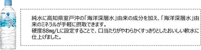 「ミウ おいしい水」は、純水に、海洋ミネラルを後から加える事で硬度を調整(硬度88mg/L)。飲みやすく、おいしい軟水に仕上げました。
