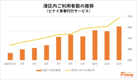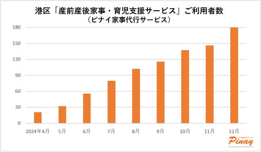 港区「産前産後家事・育児支援サービス」におけるピナイ家事代行サービスの利用は月を追うごとに拡大し、2024年12月には月間利用者数180名、合計1,355時間の家事支援サービスを提供いたしました。特に年末の大掃除需要と相まって、多くのご家庭にご活用いただきました。