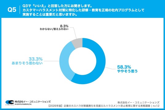 「Q5. Q3で「いいえ」と回答した方にお聞きします。カスタマーハラスメント対策に特化した研修・教育を正規の社内プログラムとして実施することは重要だと思いますか。」(n=12)と質問したところ、「非常にそう思う」が0.0%、「ややそう思う」が58.3%という回答となりました。