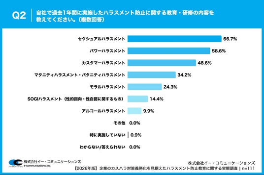 株式会社イー・コミュニケーションズ(本社:東京都港区、代表取締役:佐藤信也)は、従業員数100名以上の企業で、ハラスメント対策や社員教育・研修の企画・運営に携わっている人事・総務担当者111名を対象に、【2026年版】企業のカスハラ対策義務化を見据えたハラスメント防止教育に関する実態調査を実施しましたので、お知らせいたします。