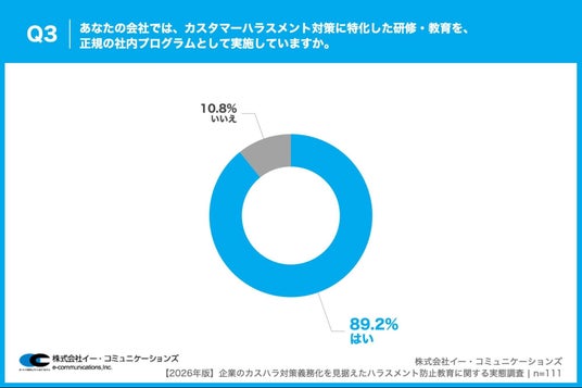 「Q3. あなたの会社では、カスタマーハラスメント対策に特化した研修・教育を、正規の社内プログラムとして実施していますか。」(n=111)と質問したところ、「はい」が89.2%、「いいえ」が10.8%という回答となりました。