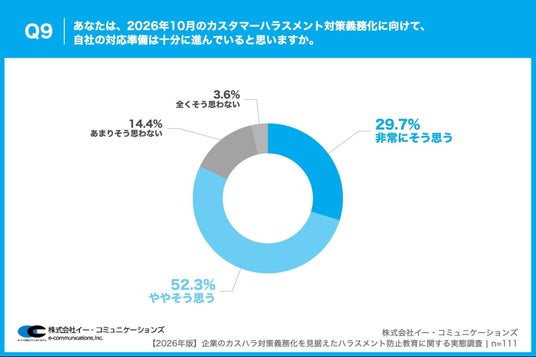 「Q9. あなたは、2026年10月のカスタマーハラスメント対策義務化に向けて、自社の対応準備は十分に進んでいると思いますか。」(n=111)と質問したところ、「非常にそう思う」が29.7%、「ややそう思う」が52.3%という回答となりました。