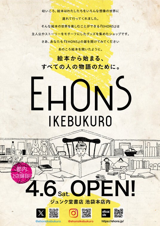 2021年10月に東京 丸の内にオープンした「EHONS TOKYO」、2022年6月に大阪 梅田にオープンした「EHONS UMEDA」、2023年3月に福岡 博多にオープンした「EHONS HAKATA」に続く店舗で、他の3店舗同様「絵本の世界を楽しむことができる空間」というコンセプトの元、オリジナルアイテムを含む、絵本の主人公やストーリーをモチーフにしたグッズを企画・制作し、書籍とともに販売いたします。