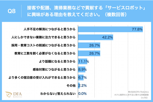 また、「サービスロボットに興味がある」(「かなりある」「ややある」)と回答した方に、その理由について質問したところ、約8割の77.8%が「人手不足の解消につながると思うから」、42,2%が「人にしかできない業務に注力できると思うから」、26.7%が「採用・教育コストの削減につながると思うから」という回答となりました。