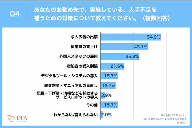また、「人材不足を補うための対策を行っている」と回答した方に、「実施している対策」について質問したところ、「求人広告の出稿」54.9%、「従業員の賃上げ」43.1%という回答となりました。