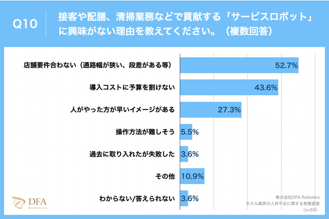 一方、「サービスロボット」に興味がある」(「あまりない」「全くない」)と回答した方に、その理由について質問したところ、52.7%が「店舗要件合わない(通路幅が狭い、段差がある等)」、43.6%が「導入コストに予算を割けない」、27.3%が「人がやった方が早いイメージがある」という回答となりました。