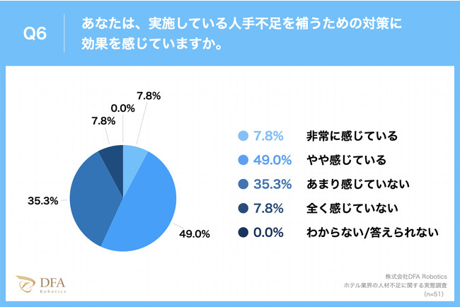 「人材不足を補うための対策を行っている」と回答した方に、「実施している人材不足の対策に効果を感じているか?」と質問したところ、「あまり感じていない」35.3%、「全く感じていない」7.8%という結果になり、何らかの施策を行っているものの、43.1%が人材不足への対策に関して効果を感じられていない結果となりました。