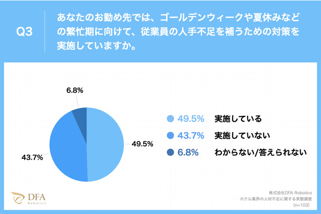 「繁忙期に向けて、従業員の人材不足を補うための対策を行っているか?」と質問したところ、49.5%が「実施している」、43.7%が「実施していない」と回答しました。