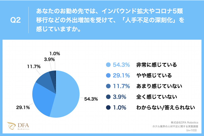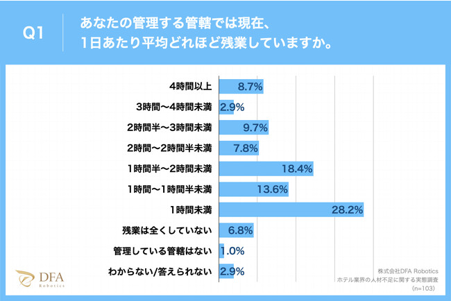 飲食店DXを推進するロボティクスソリューションカンパニーである株式会社DFA Robotics(本社:東京都渋谷区、代表取締役:波多野 昌昭)は、ホテル業界の人材不足に関する実態について、ホテルの管理職(支配人・マネージャー・部長職)103名を対象にアンケート調査を行いましたので、その結果をお知らせします。
