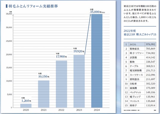 2022年度の東京23区 粗大ごみトップは【ふとん】で約100万枚が廃棄償却処分されています。羽毛ふとんリフォームは粗大ゴミを減らす一因にも繋がります。