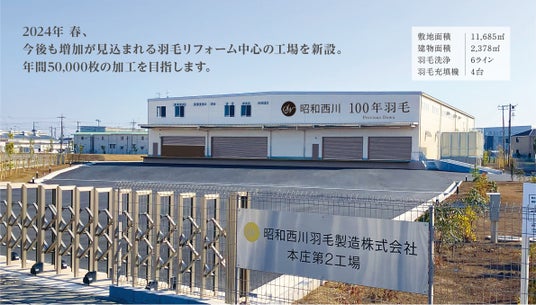 昭和西川株式会社は4月、埼玉県本庄市に羽毛ふとんリフォーム工場を新設しました。日本で加工規模最大級の工場は、羽毛洗浄6ライン、充填機4台を設置、年間5万枚を目指します。(7月現在 羽毛洗浄は現在4ライン、8月に2ライン増加予定)