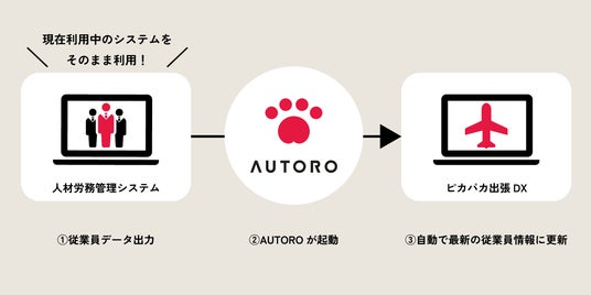 「ピカパカ出張DX」と人材情報の基となる人事労務管理システム間のデータをAUTOROが自動連携いたします。