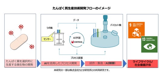 さらに、本研究の成果は、NEDOが公募した「バイオものづくり革命推進事業」において、味の素社のテーマである「環境保護と食品供給の安定化を実現する精密発酵技術の開発」(※3)に活用されることとなりました。AI制御技術を活用したたんぱく質生産プロセスの開発を行い、迅速かつ高い生産性の実現を目指すという内容です。