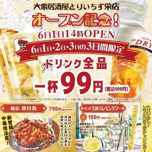 【3日間限定】『大衆居酒屋とりいちず栄店』オープン記念キャンペーン開催!6月1日(土)、6月2日(日)、6月3日(月)の3日間限定!何杯でもドリンク1杯99円(税込109円)!