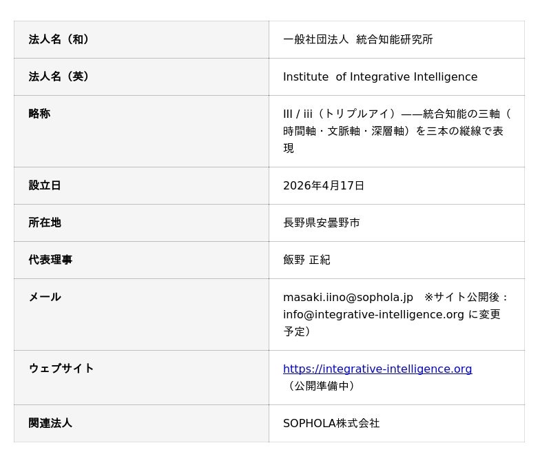 SOPHOLA株式会社(所在地:長野県安曇野市、代表取締役:飯野 正紀)は、2026年4月17日付にて、一般社団法人 統合知能研究所(英名:Institute of Integrative Intelligence、略称:III / iii)を設立したことをお知らせします。