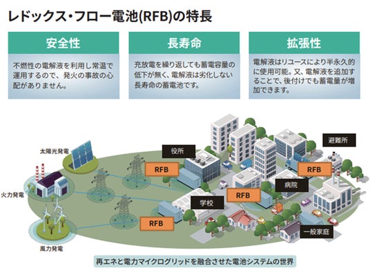 COP30では、長期化する停電被害に備え、再生可能エネルギーとの親和性が高く、より安全な蓄電池の「レドックス・フロー蓄電池」を太陽光発電システムと組み合わせてご提案いたします。