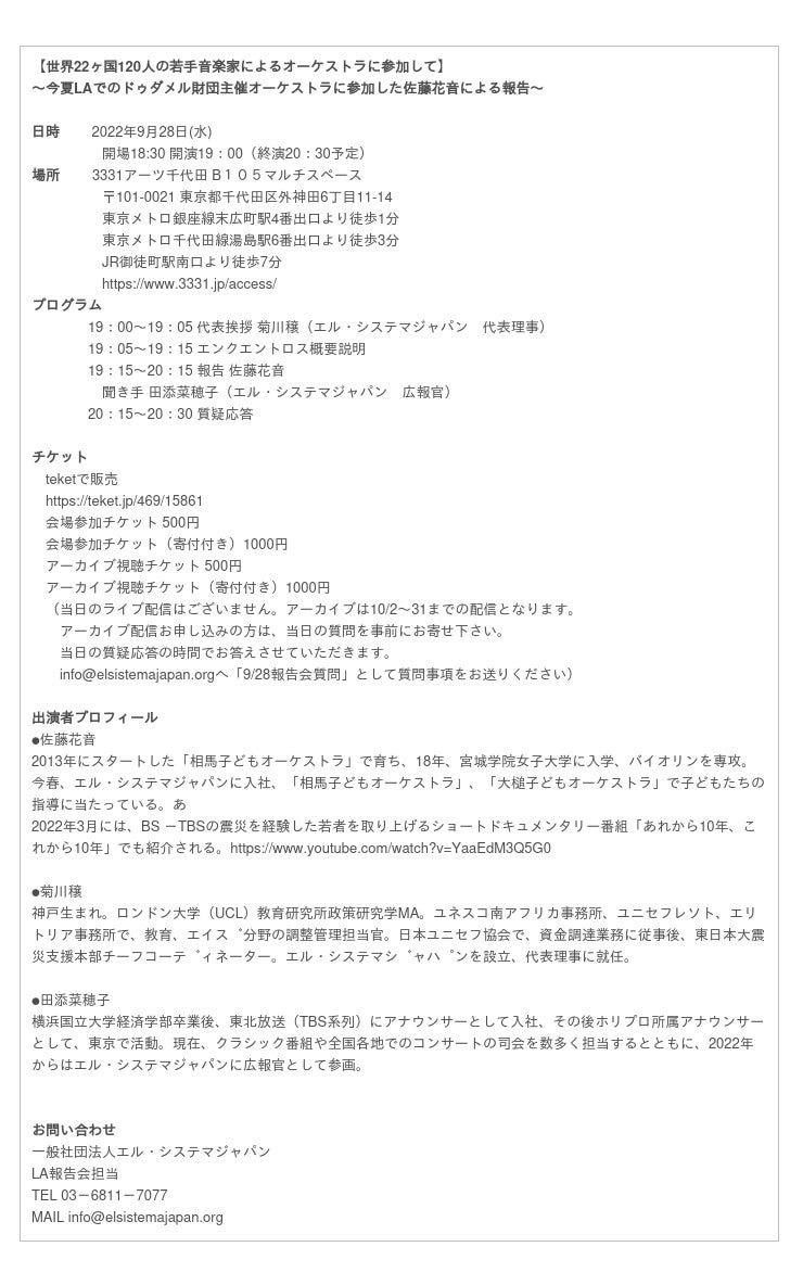 今年7月から8月の3週間にわたり、世界的指揮者グスターボ・ドゥダメルを始め、世界トップ奏者の指導を受け、ロサンゼルスでのコンサートを成功させた若手音楽家オーケストラ「エンクエントロス・オーケストラ」。ドゥダメル財団と名門ロサンゼルス・フィルが主催し、世界22ヶ国、34団体からなる120人の若手音楽家を集めてのビッグプロジェクトに、日本から唯一参加したのが、エル・システマジャパン弦楽器指導者・佐藤花音です。一般社団法人エル・システマジャパン(東京都千代田区)は、9月28日(水)に佐藤花音がこのプロジェクトでの体験を語る報告会【世界22ヶ国120人の若手音楽家によるオーケストラに参加して】を開催します。