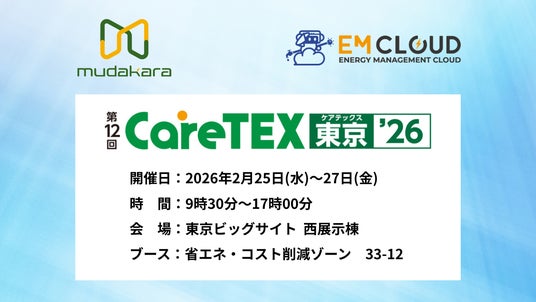 株式会社ムダカラ(本社:東京都港区、代表取締役:田崎 太郎、以下「当社」)の提供するエネルギーマネジメントシステム"EM CLOUD"(イーエムクラウド)は、2026年2月25日(水)~27日(金)に東京ビッグサイトで開催される「CareTEX東京’26」に出展します。