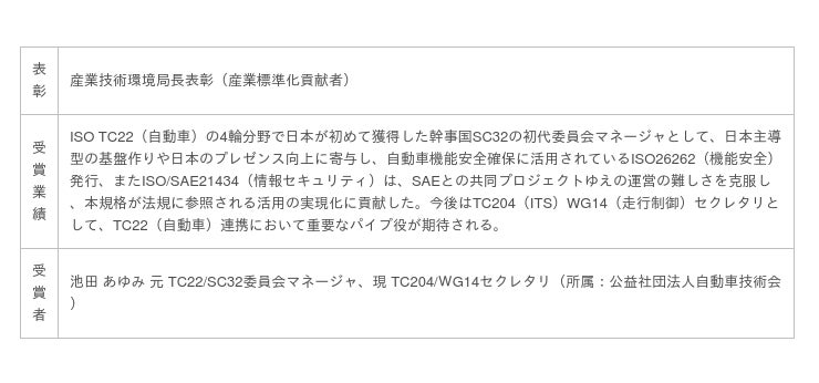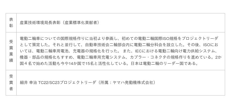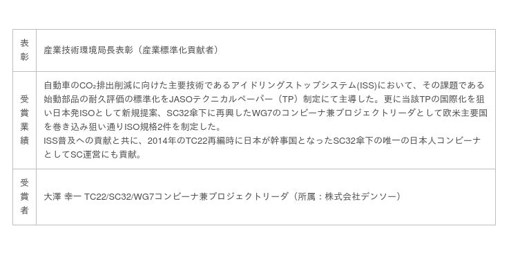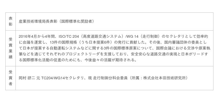 産業標準化事業表彰(経済産業大臣表彰)は、標準化活動や適合性評価活動などに貢献し、国際標準化・産業標準化に顕著な功績のあった個人及び組織に対して経済産業大臣表彰を行うことにより、我が国産業の発展に資することを目的としています。