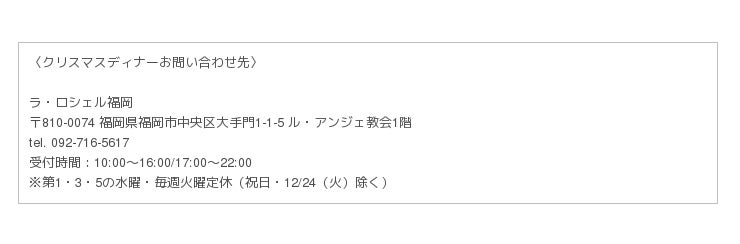 そして、12月22日(日)~25日(水)までの期間限定で、赤坂ル・アンジェ教会内 ラ・ロシェル福岡(https://www.la-rochelle.co.jp/shop/fukuoka)において、例年満席御礼のクリスマス特別ディナーは、予約受付中。特別な記憶に残る一皿を、大切な方と共にご堪能いただけます。レストランのご予約・お問い合わせはラ・ロシェル福岡 ( tel. 092-716-5617 / 受付時間 10:00~16:00/17:00~22:00 )までお願いいたします。