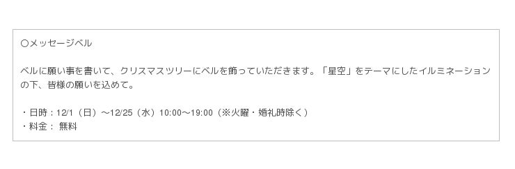 イルミネーションの他、クリスマスイベントではベルに願い事を書いてクリスマスツリー飾る“メッセージベル”や、歌声が美しく響き渡る礼拝堂の中でクリスマスソングをお楽しみいただけるゴスペルコンサート(事前要予約)、そして大理石のバージンロードに無数のキャンドルが煌めくキャンドルナイトを開催予定です。