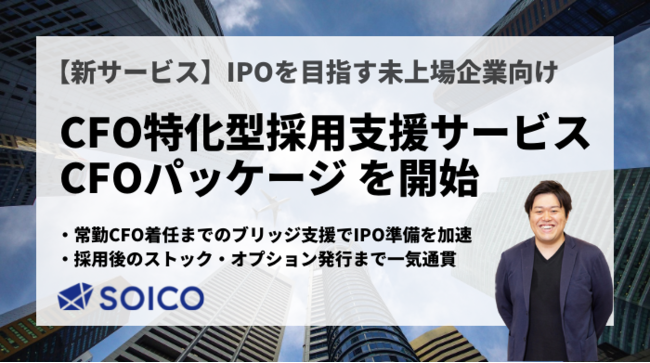 SOICO株式会社(本社:東京都港区、代表取締役CEO:茅原淳一、以下「SOICO」)は、未上場企業向けにCFO人材の採用支援からストックオプションの発行支援までワンストップでサポートする「CFOパッケージ」を開始いたします。上場準備に欠かせないCFO人材の採用を金融業界での経験豊富なSOICOが全面サポート致します。