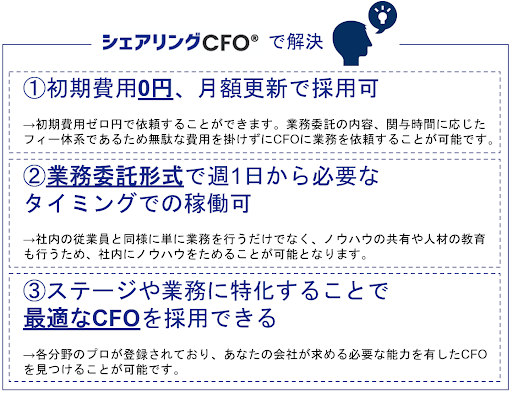 「シェアリングCFO(R)」事業は、スタートアップにおける、『CFOをフルタイムで採用するのはコストがかかる』『CFO業務がまだ曖昧かつ限定的』『最適なCFOが転職マーケットにいない』といった悩みを解決する人材サービスです。それぞれの企業のフェーズにあったスキルを持つプロフェッショナルなCFO候補を、必要な時に必要な業務だけ、初期費用0円で依頼できるマッチングプラットフォームです。