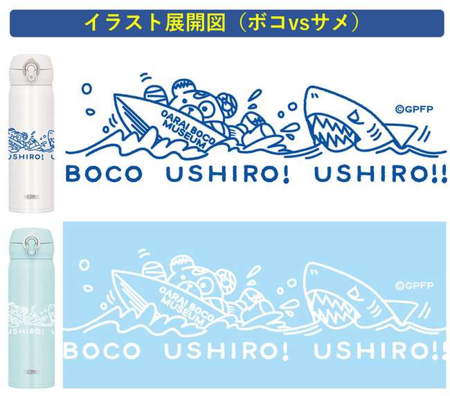 「ボコミュージアムで売っていそうなグッズ」というコンセプトの下、大洗の海で戦っている(逃げている…?)「ボコvsサメ」&ボコミュージアムの人気アトラクション「スペースボコンテン」が描かれたケータイマグです。