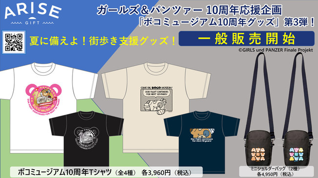 合わせて、当ショップで展開しているガールズ&パンツァー10周年応援企画「ボコミュージアム10周年記念グッズ」の第3弾が本日より一般販売を開始しました。ボコ10周年にちなんだTシャツと、ミニショルダーバッグです。是非、上記のケータイマグと共に、お買い求め下さい。