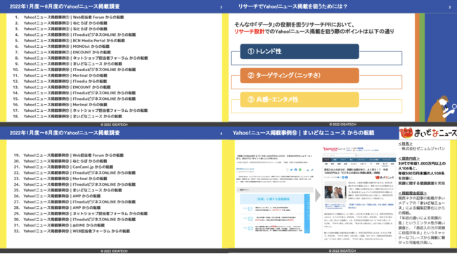 2022年1月~6月期にYahoo!ニュースに掲載された全32の調査リリース掲載事例を、転載元の媒体やYahoo!ニュースに掲載された理由の仮説などと共に、徹底解説した資料です。