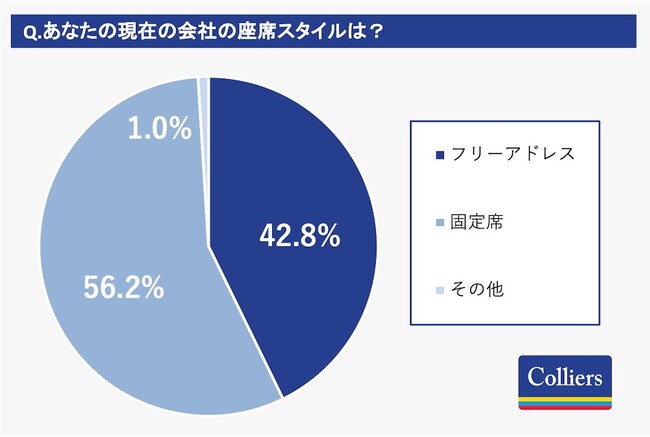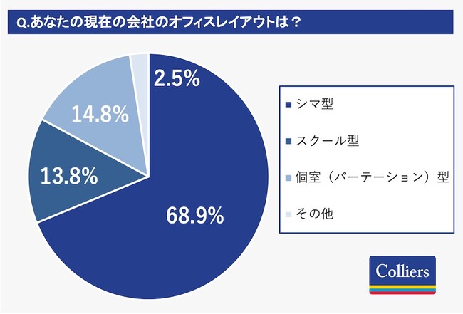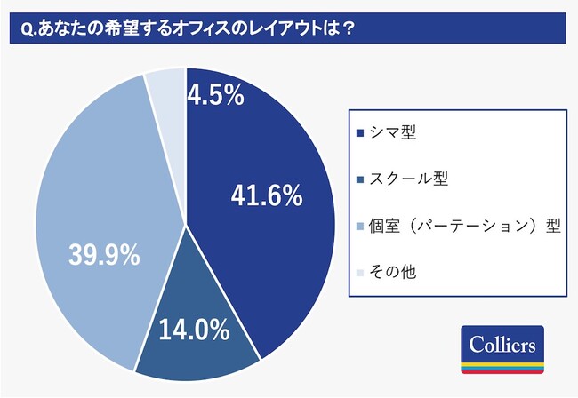 回答者自身のオフィスのデスク環境は、42.8%がフリーアドレス制で、56.2%が固定席。またオフィスのレイアウ トとしては 68.9%がシマ型、14.8%が個室(パーテーション)型、13.8%がスクール型となっています。 一方で希望するオフィスレイアウトの質問では、シマ型が41.6%に数値が減り、個室(パーテーション)型が 39.9%に数値が増えており、現在のオフィスレイアウトと希望するオフィスレイアウトにはズレが見られました。