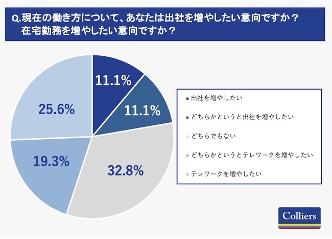 今後の出社頻度の増減に関する意向を聞いた質問では、テレワークを増やしたい層(計44.9%)が出社を増やしたい層(22.2%)やどちらでもない層(32.8%)を上回る結果となりました。