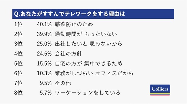 今回の調査回答者のテレワーク導入率は64.9%となっています。回答者がすすんでテレワークをする理由としては「感染防止のため」「通勤時間がもったいない」が多く選ばれた一方、すすんでテレワークをしない理由としては「会社の方針のため」「社員とのコミュニケーションのため」が多く選ばれました。