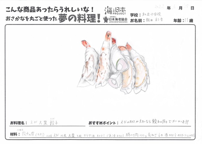 一般社団法人日本海老協会(事務局:東京都中央区築地6-23-12 代表理事:藤井務)は、全国の保育園・幼稚園、小中学生、高校生を対象とした、エビを丸ごと使用したアイデア料理を募集する『えび丸ごと夢の料理コンテスト』の受賞者を2022年9月1日に公式Webサイト(https://ebikyoukai.jp/ebifes/dream_cooking/) にて発表しました。670作品の中から栄えある大賞を受賞した6名の子どもたちは、『海老の日(R)』祭りエビフェス!2022inOSAKAの阪神梅田本店1階食祭テラスの特設ステージで海老料理の出展者により表彰される予定です。このイベントは、次世代へ海を引き継ぐために、海を介して人と人とがつながる“日本財団「海と日本プロジェクト」”の一環です。