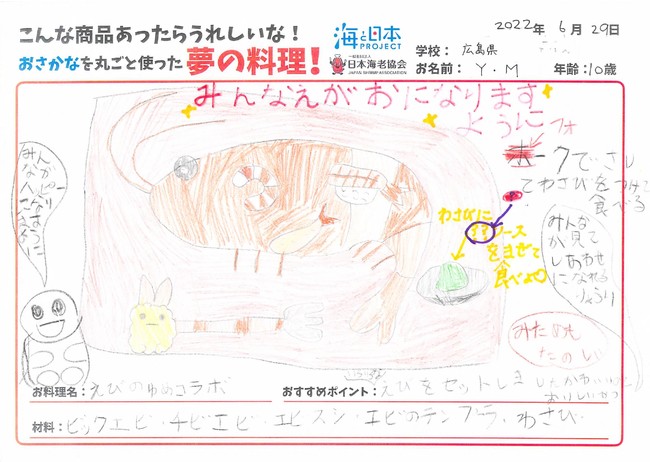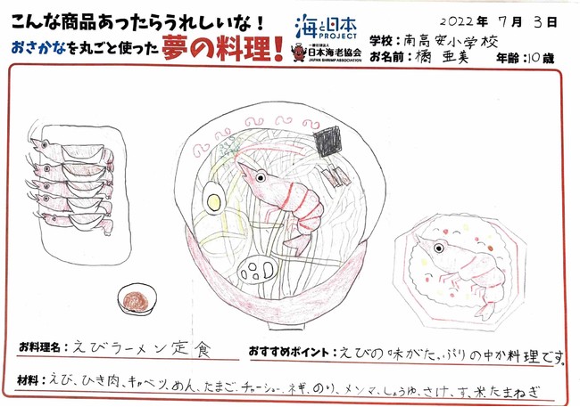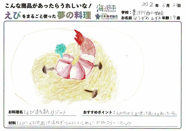 本コンテストは、尾頭殻付きのまるごとの海老の解剖動画を見ながら解剖を行った上で、「えび丸ごと夢の料理」を描いてもらうことで、日本の海を守っていく大切さや魚食文化、生産者への理解を深めてもらい、未来を担う子どもたちが、きれいな海とおいしい海産物をつなぐきっかけになることを狙いとしており、オンライン公募を通じて多数の子どもたちに参加いただきました。