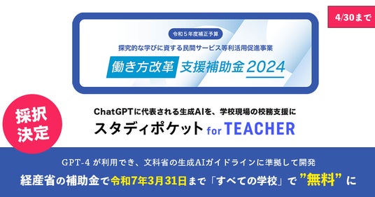 学校向け、校務DXを推進する生成AIクラウドサービス「スタディポケット for TEACHER」は、経済産業省「令和5年度補正予算 探究的な学びに資する民間サービス等利活用促進事業費補助金」に採択されたことにより、1年間無料で提供できることになりましたので、お知らせいたします。