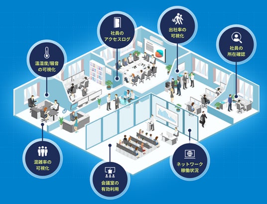 オフィスでの社員の所在や会議室の利用状況、ネットワークの稼働状況などの情報を可視化し、働きやすい環境を構築するクラウドサービスです。クラウド管理型ネットワークソリューション「Cisco Meraki」および統合セキュリティプラットフォーム「Verkada」、各種グループウェアやクラウドサービスと連携し、スマートオフィスを実現します。
