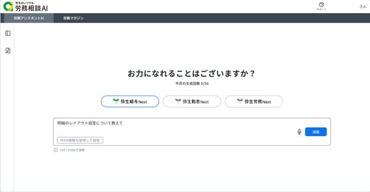 労務相談に加え、「弥生給与 Next」「弥生勤怠 Next」「弥生労務 Next」における操作・設定方法を法令・制度の観点から解説とセットで確認することが可能です 。弥生ユーザーの業務フローに即した形で、AIによるサポートを提供します。