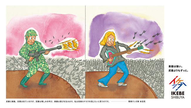 「武器と楽器。言葉は一見似ていますが、武器は憎しみを呼び、楽器は喜びを生みます。」そんな言葉とともに、SNSに投稿された一枚のイラスト。武器から弾丸を飛び散らせている兵士からは、人々が恐れ逃げている一方、楽器から音楽を溢れさせているアーティストの周りには、多くの人々が集まり喜びを表現しています。本田亮さんのこのイラストに、池部楽器店が強く共感し、今回のコラボレーションが実現しました。本田さんには無償でイラストを提供いただき、第一弾として“音楽・楽器の次世代型ストア” イケシブ(IKEBE SHIBUYA)店舗内のサイネージでポスターとして展開。第二弾として、イラストを使用したチャリティグッズの販売などを予定しています。