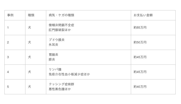 ※上記の数値は、PS保険加入者さまから請求されたものであり、ペットメディカルサポートが補償する範囲を示すものではありません。また、平均や水準を示すものでもありません。