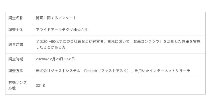 SaaSとデジタル人材で企業のマーケティングDXを支援するアライドアーキテクツ株式会社(東京都渋谷区、代表取締役CEO:中村壮秀、証券コード:6081)は、企業のDX推進における動画活用の実態を調査するためインターネットリサーチを実施し、全国20~50代の会社員および経営者のなかで業務において「動画コンテンツ」を活用した施策を実施したことがある217名が回答しました。