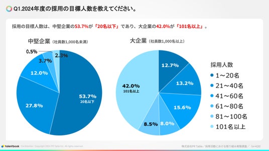 1. 2024年度の採用目標人数は、中堅企業の53.7%が「20名以下」であり、大企業の42.0%が「101名以上」である。